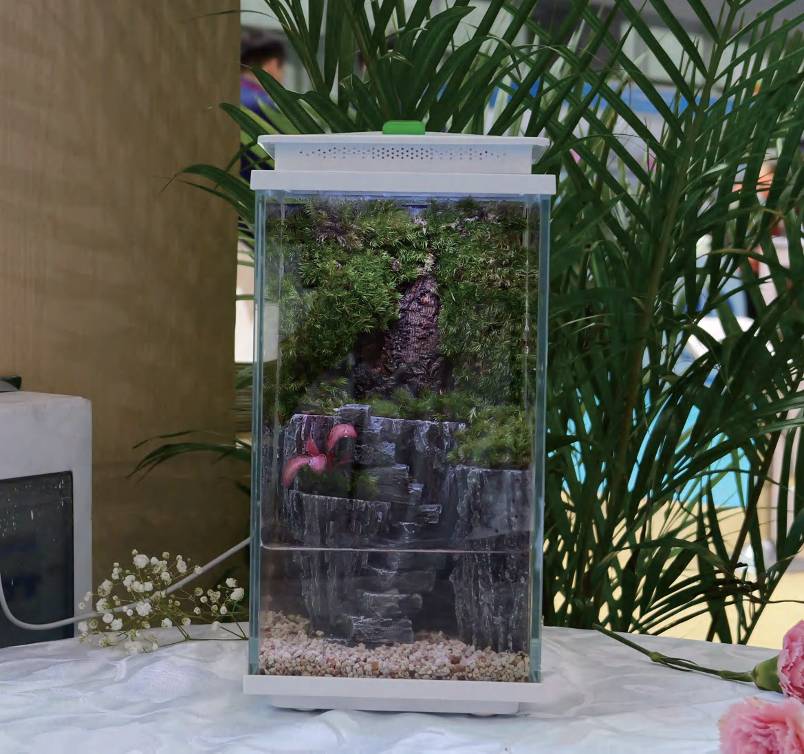 階段状のデザインにシャンパンカラーの樹皮背景パネルを組み合わせ、培養土やコケを植えることで、手軽に自然の景観をDIYできます。